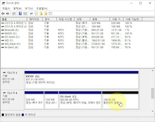 ▲ 윈도우10이 인스타 설정된 디스크의 파티션을 나누어 봅시다. 현재 공용량인 517GB중 100GB를 분리하여 새로운 드라이브로 생성해보겠습니다.